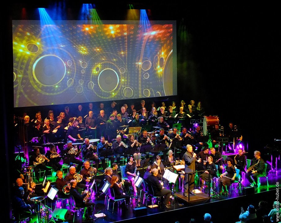 Er bedankte sich beim ganzen Team der Stadtkapelle, besonders bei Stefan Müller und Marco Mast für "Licht und Bilder". Die 730 Besucher in der ausverkauften Stadthalle erklatschten sich stehend und skandierend noch mehrere Zugaben, die Wolfgang Riedmann und seine Musiker auch sichtlich gerne gaben.
